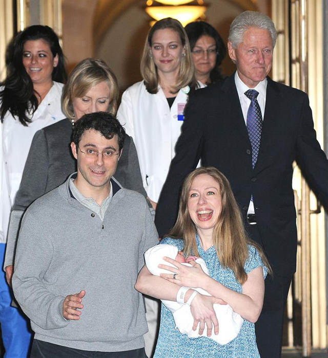 Chelsea Clinton, 34, carried newborn Charlotte Mezvinsky as she left New York City’s Lenox Hill Hospital on Tuesday, accompanied by her husband, Mark Mezvinsky, and proud grandparents Hillary and Bill Clinton. (9/30/14)